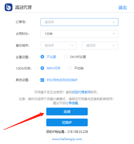 3. 点击连接按钮立即获取IP,切换IP将切换您选择省份时长的IP进行自动切换;如遇IP异常情况,也将为您切换IP。